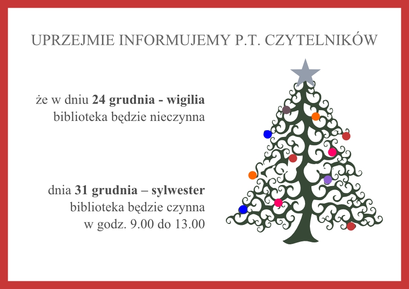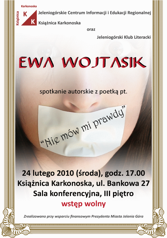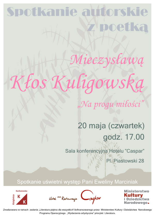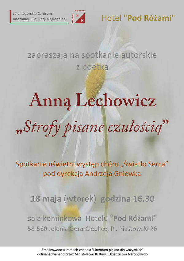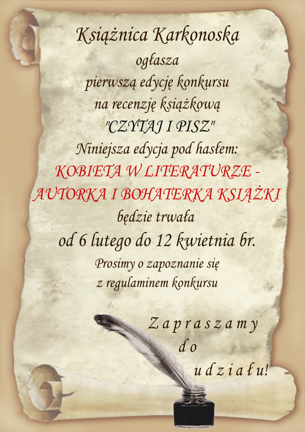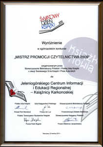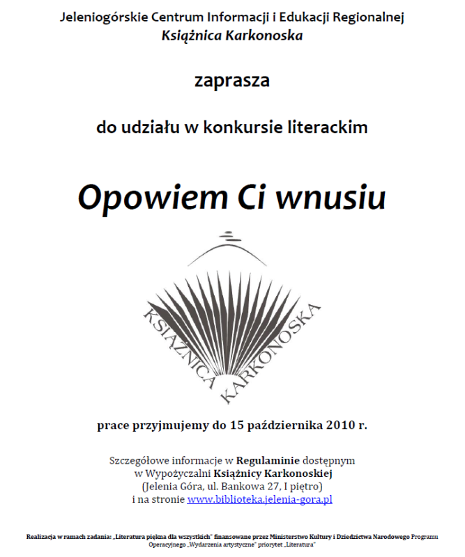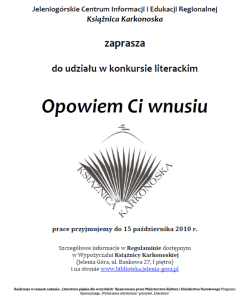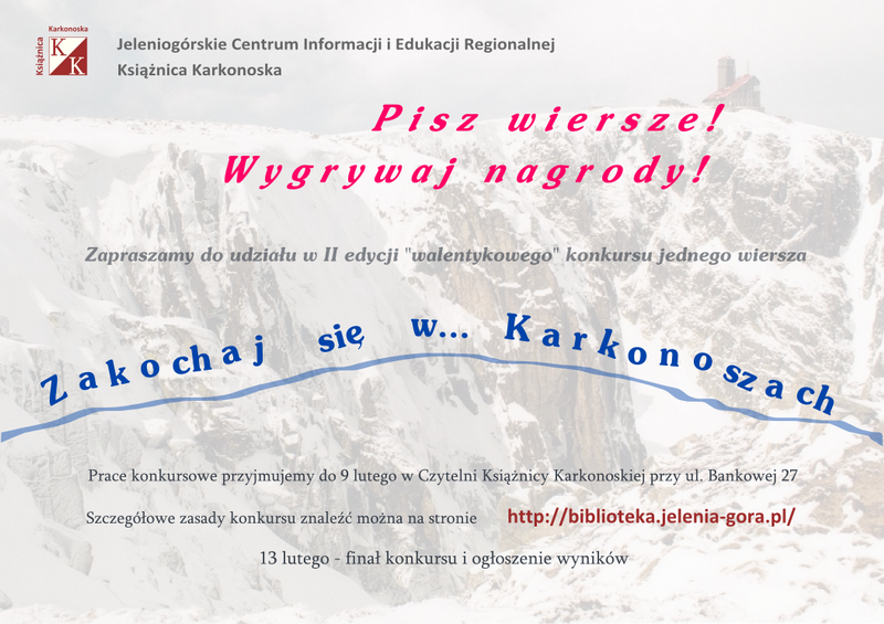 Nagrody i dyplomy dla zwycięzców i wyróżnionych w konkursie będą do odebrania od 14 grudnia br. w Wypożyczalni (godziny otwarcia na stronie internetowej Książnicy Karkonoskiej). W imieniu organizatorów wszystkim uczestnikom gratulujemy i dziękujemy za udział w naszym konkursie. Nagrody zakupiono ze środków Ministerstwa Kultury i Dziedzictwa Narodowego z Programu Operacyjnego Wydarzenia artystyczne priorytet Literatura