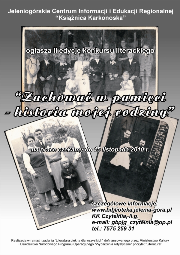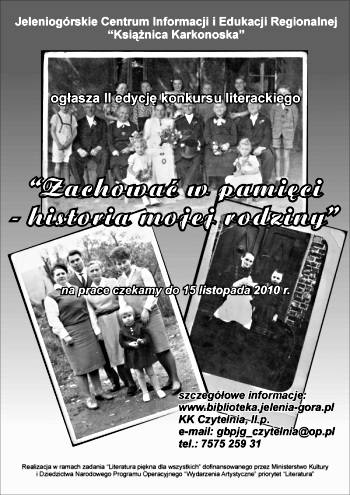 W sobotę 4 grudnia w sali konferencyjnej Książnicy Karkonoskiej odbyło się uroczyste ogłoszenie wyników konkursu „Zachować w pamięci – historia mojej rodziny”. Na konkurs wpłynęło 45 prac 41 autorów z Jeleniej Góry, Lubania, Szklarskiej Poręby, Kowar, Wrocławia, Katowic, Oświęcimia, Warszawy czy Wejherowa.