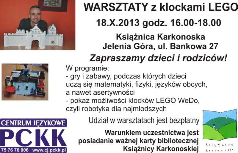 „MALI ARCHITEKCI” – zabawa ze światłem dla „małych architektów” - warsztaty i pokazy przygotowane przez arch. Karolinę Szkapiak - Vice Prezesa SARP Jelenia Góra wraz z zespołem (miejsce: Jelenia Góra – Książnica Karkonoska, ul. Bankowa 27). czynna w godz. 16.00 – 20.00. W piątek o godzinie 19.30 oraz w sobotę o godzinie 17,45 zapraszamy na wystawę prac na trzecim piętrze Książnicy Karkonoskiej.
