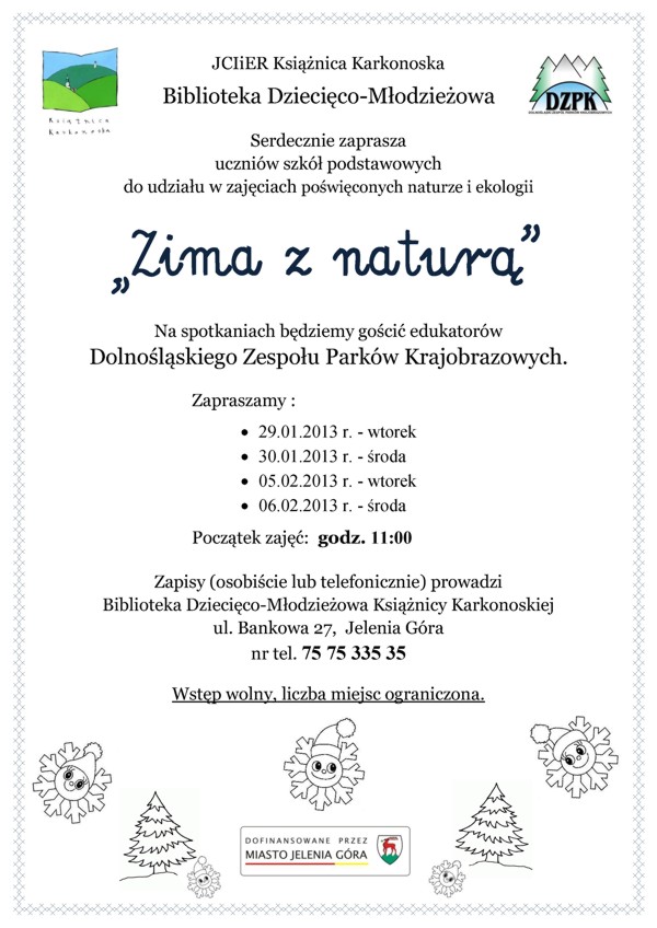 Filia Nr 6 Książnicy Karkonoskiej zaprasza na "Ferie w bibliotece" w dniach 30 stycznia oraz 6 lutego.