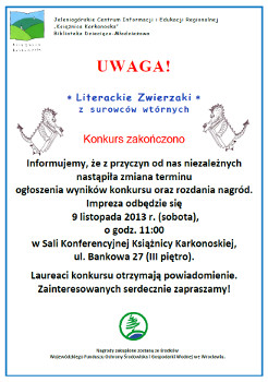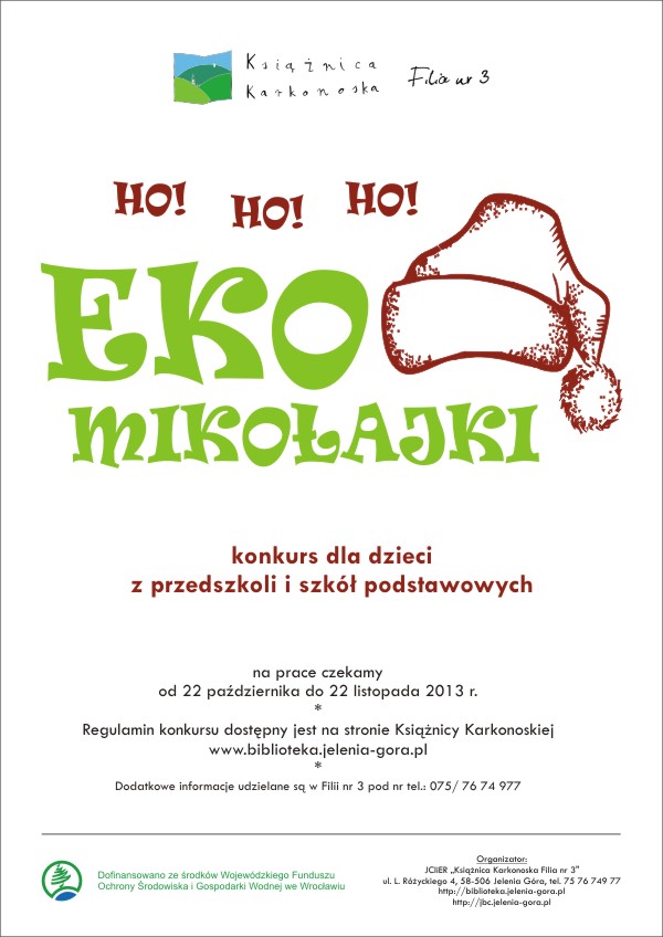 Uroczystość wręczenia nagród w konkursie „Eko Mikołajki” odbędzie się w Filii Nr 3 JCIiER Książnicy Karkonoskiej przy ul. Różyckiego 4 w Jeleniej Górze w dniu 07.12.2013r. (sobota) o godz. 10.30.