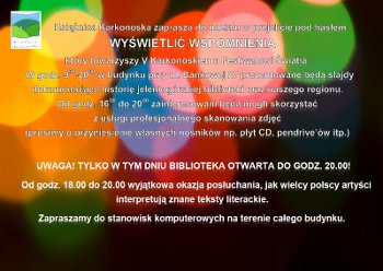 Książnica Karkonoska zaprasza do udziału w towarzyszącym Festiwalowi projekcie pod hasłem „Wyświetlić wspomnienia”. Przez cały dzień od godz. 9.00 do 20.00 w budynku przy ul Bankowej 27 prezentowane będą slajdy dokumentujące historię jeleniogórskiej Biblioteki oraz naszego regionu, zaś od godz. 16.00 do 20.00 zainteresowani będą mogli skorzystać z usługi profesjonalnego skanowania zdjęć (prosimy o przyniesienie własnych nośników np. płyt CD, pendrive’ów itp.)